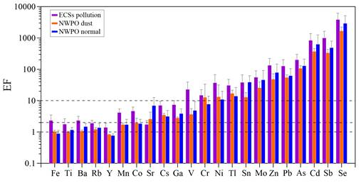 根据地壳富集因子(EF,图3)、相关性分析(详见补充材料)、不同来源的特征金属组分(详见补充材料)和正交矩阵因式分解模型结果(PMF,详见补充材料),本研究总结了三类ECSs污染TSPs、NWPO中沙尘和正常TSPs中痕量金属的潜在来源。结果发现,地壳矿物、船舶排放、化石燃料燃烧、海洋排放是所测金属组分最主要的贡献源。