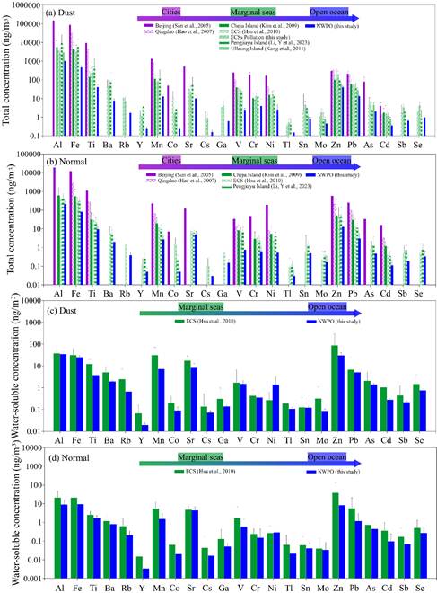 基于所测金属组分、离子浓度以及卫星数据,本研究将巡航期间的样本分为ECSs污染TSPs、NWPO中沙尘和正常TSPs三类。研究发现,几乎所有观测金属的总浓度和水溶性浓度都呈现出中国城市>近海(东海)>公海(NWPO)的梯度变化,这体现了大气的清除作用。相比之下,地壳元素(如Al、Fe和Ti)有更快的清除速率,而人为金属(如Zn、Pb和Cd)清除速率有所减弱,这与痕量金属的粒径分布有直接的关系(图2)。