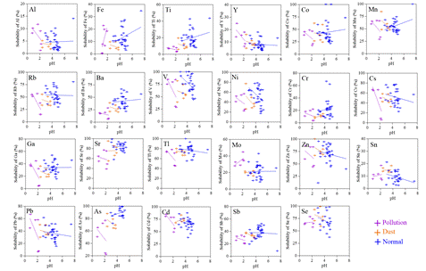 图4 不同TSPs中金属溶解度与气溶胶pH值的关系