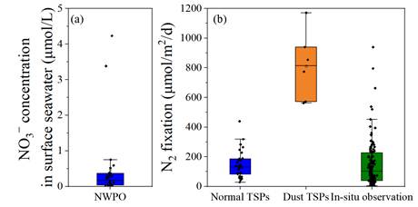 图5(a)NWPO表层海水中NO3−的浓度;(b)通正常TSPs和沙尘TSPs中沉降的海水溶解铁估算的N2固定量与NWPO中先前的现场观测值比较