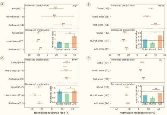 全球变暖改变了全球降水模式并导致降水变异增加,这种趋势预计在未来几十年将持续。在未来降水变异增加的背景下,全球陆地生态系统碳汇是否会发生改变仍不清楚。基于此,本研究通过整合分析,同时结合TRENDY模型和遥感数据,量化了陆地生态系统碳汇对降水变异的响应。研究发现在相同降水变化情况下,生态系统碳汇对降水改变呈现正的非对称性响应,即降水增加处理下生态系统碳汇的增加幅度(33.4%)大于降水减少处理下生态系统碳汇的减少幅度(-24.62%),且在干旱地区(年降水< 500 mm)的正非对称性响应大于湿润地区(年降水> 500 mm)(图1)。