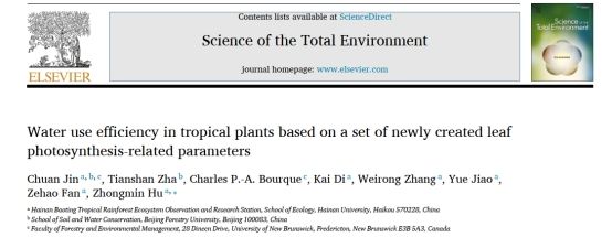 在全球气候变化的背景下,水分利用效率(WUE)作为植物适应环境变化的重要指标,已成为生态学研究中的关键参数之一。植物的水分利用效率反映了其在光合作用过程中每单位干物质积累所消耗的水量这一参数不仅揭示了植物的水资源利用效率,也与植物的生长、适应策略以及应对环境压力的能力密切相关。然而,现有的WUE研究大多集中在稳定环境下的瞬时水分利用效率(WUEi)上,忽视了自然光照波动对植物WUE的影响。为此,本研究创新性地提出了一套与WUE相关的全新参数,包括最大水分利用效率(WUEmax、水分潜力系数WPC)、水分损失系数(WLC水分策略系数(WSC)和水分综合系数(WTC48种典型热带植物的水分利用效率进行了全面评估旨在更准确地评估热带植物在自然光变化中的水分利用策略。本研究于202411月以“Water use efficiency in tropical plants based on a set of newly created leaf photosynthesis-related parameters”为题发表于生态环境领域著名期刊Science of the Total Environment(一区Top5IF: 8.6)。