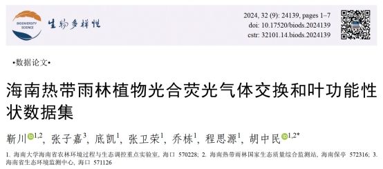 在热带雨林中,光照、温度和水分等环境因素复杂交织,使植物的光合特性展现出丰富多样性。由于热带雨林的恶劣环境和野外测量工作的复杂性,获取详细的植物叶片光合生理数据极具挑战。鉴于此,研究团队在海南保亭七仙岭温泉国家森林公园使用2套便携式光合测量仪等设备对当地48种优势物种进行了叶片光合生理相关观测。研究团队将数据整理成数据论文,向学术界分享这些发现。本研究于202411月以“海南热带雨林植物光合荧光气体交换和叶功能性状数据集”为题发表于生态领域著名期刊生物多样性(中国科技期刊卓越计划期刊)。