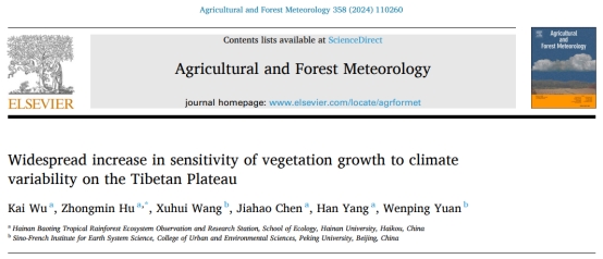 近日,888娱乐城 生态服务功能监测与评估团队在国际著名期刊Agricultural and Forest Meteorology发表题为“Widespread increase in sensitivity of vegetation growth to climate variability on the Tibetan Plateau”的研究论文(//www.sciencedirect.com/science/article/pii/S0168192324003733)。该论文的第一作者为团队青年教师吴凯,通讯作者为胡中民教授,海南大学为第一完成单位。