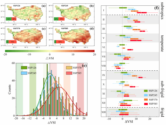 3 (a-d)未来时期(2015-2100年)不同气候情景下青藏高原VSI的空间格局,(e-f)突显了不同气候情景下VSI与历史时期(1950-2014 年)VSI的差异