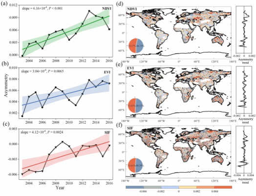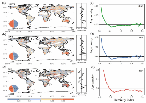 图2 基于归一化植被指数(NDVI)(a)、增强型植被指数(EVI)(b)、日光诱导叶绿素荧光(SIF)(c)的非对称性空间格局,以及利用NDVI(d)、EVI(e)和SIF(f)估算的非对称性随湿度指数梯度的空间变化