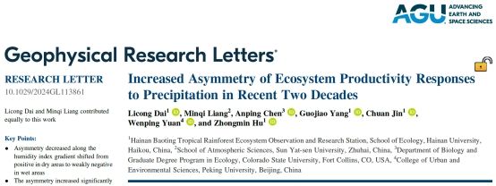 生态服务功能监测与评估团队在国际著名期刊Geophysical Research Letters发表题为“Increased asymmetry of ecosystem productivity responses to precipitation in recent two decades ”的研究论文(//doi.org/10.1029/2024GL113861)。该论文的第一作者为戴黎聪副教授和中山大学梁敏琪博士,通讯作者为胡中民教授,888集团娱乐官网