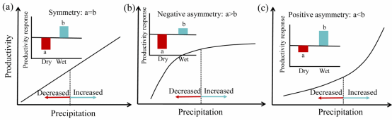 全球变暖改变了全球降水模式并导致降水变异增加,这种趋势预计在未来几十年将持续。在未来降水变异增加的背景下,全球陆地生态系统生产力是否会发生改变仍不清楚。传统研究认为,植被生产力与降水呈线性关系,即湿润年与干旱年的生产力变化相互抵消。但越来越多的观测试验表明,生态系统生产力对降水改变的响应存在非对称性关系。目前现有研究多聚焦特定区域(如半干旱草地或温带森林),对于全球陆地生态系统生产力对降水变异时间和空间上的研究尚不清楚,导致对未来生产力预测存在较大不确定性。