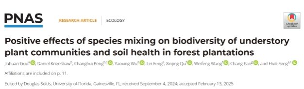 元素生物地球化学研究团队成员郭佳欢博士以“Positive effects of species mixing on biodiversity of understory plant communities and soil health in forest plantations”为题在《美国科学院院刊》(PNAS)上发表最新研究成果(原文链接://doi.org/10.1073/pnas.2418090122),并被选中在PNAS Showcase on Kudos展示。