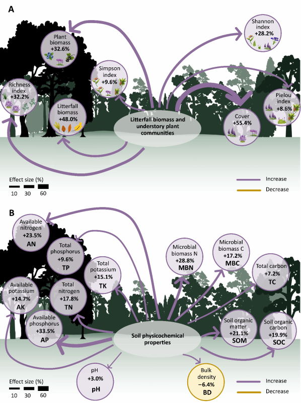 混交林在维持森林生物多样性与土壤健康方面的潜力日益受到关注,然而目前尚缺乏对其全球效益的系统评估。为填补这一知识空白,这项研究整合了全球311项针对不同森林生态系统的研究数据,对混交林与纯林进行了7,045组配对观测的荟萃分析(图1)。研究发现,与纯林相比,混交林显著提高了林下植物生物量(32.6%)、盖度(55.4%)和物种丰富度(32.2%),香农多样性指数与皮洛均匀度指数分别提升28.2%和8.6%,辛普森多样性指数增加9.6%(图2)。当区分灌木层与草本层时,树种混交对灌木多样性具有显著正向效应,但对草本多样性无显著影响。