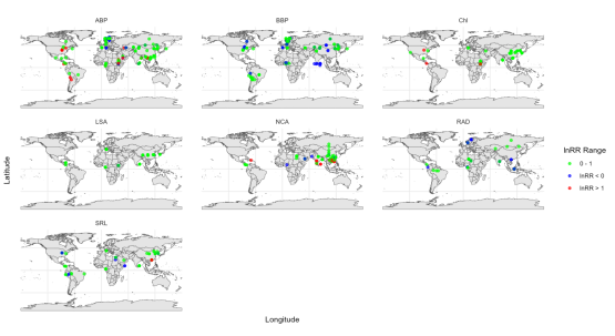 热带雨林生物多样性保护及恢复团队收集1990 - 2024 年公开发表文献的 906 个磷素添加实验数据,通过荟萃分析评估磷素添加对树木地上生物量生产力 (ABP)、叶绿素含量 (Chl)、叶表面积 (LSA)、净碳同化速率 (NCA)、地下生物量生产力 (BBP)、比根长 (SRL) 和根平均直径 (RAD)的直接和间接影响(图1)。