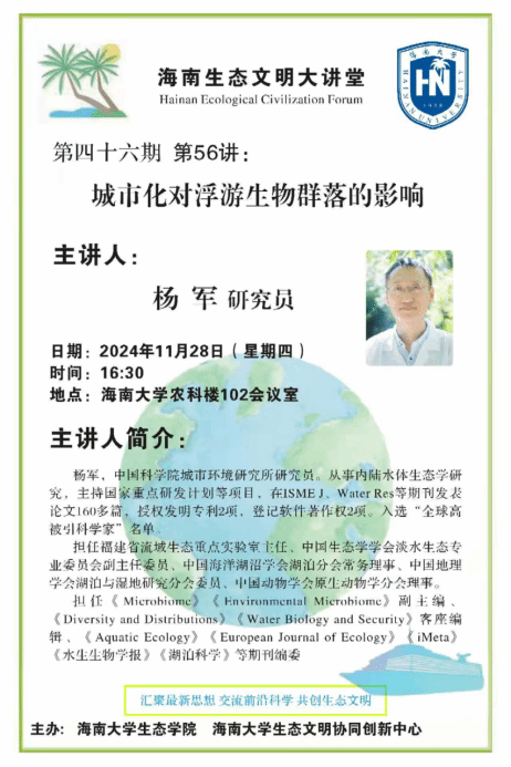 20241128日下午,中国科学院城市环境研究所研究员杨军在海南大学农科楼102会议室为师生们做了题为《城市化对浮游生物群落的影响》的主题报告。本次会议由888集团娱乐官网 赵洪伟教授担任主持人。